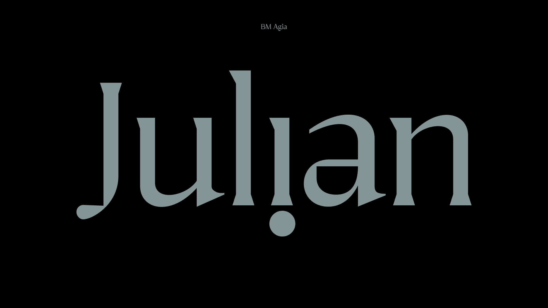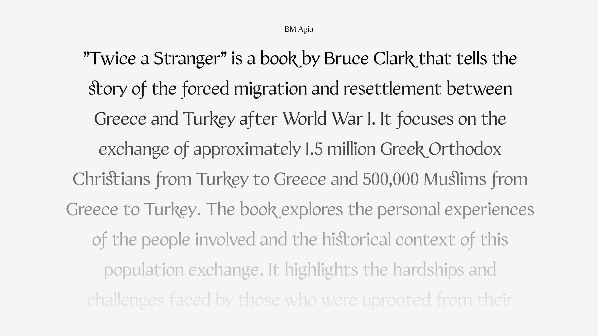 This typeface emerged from my personal curiosity about the events unfolding in the Balkans and Mesopotamia during the late 1800s, With my own personal connections to these regions, I delved into the stories that unfolded. Inspired by the stories of becoming strangers to once-familiar neighbors, of loss and separation, I decided to create lettering that captured their essence which in the end became BM Agia typeface.