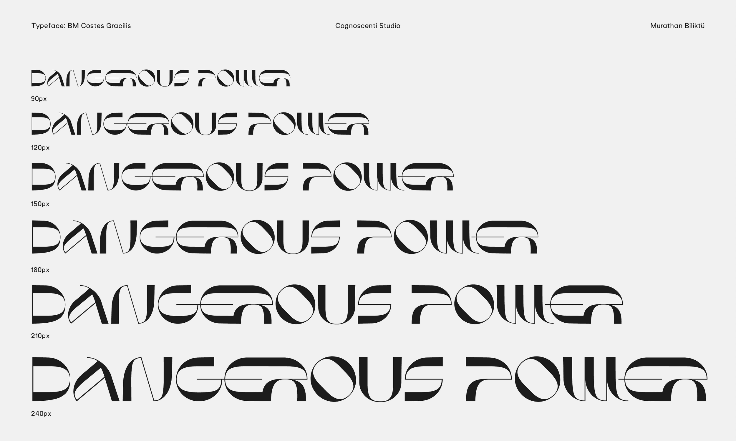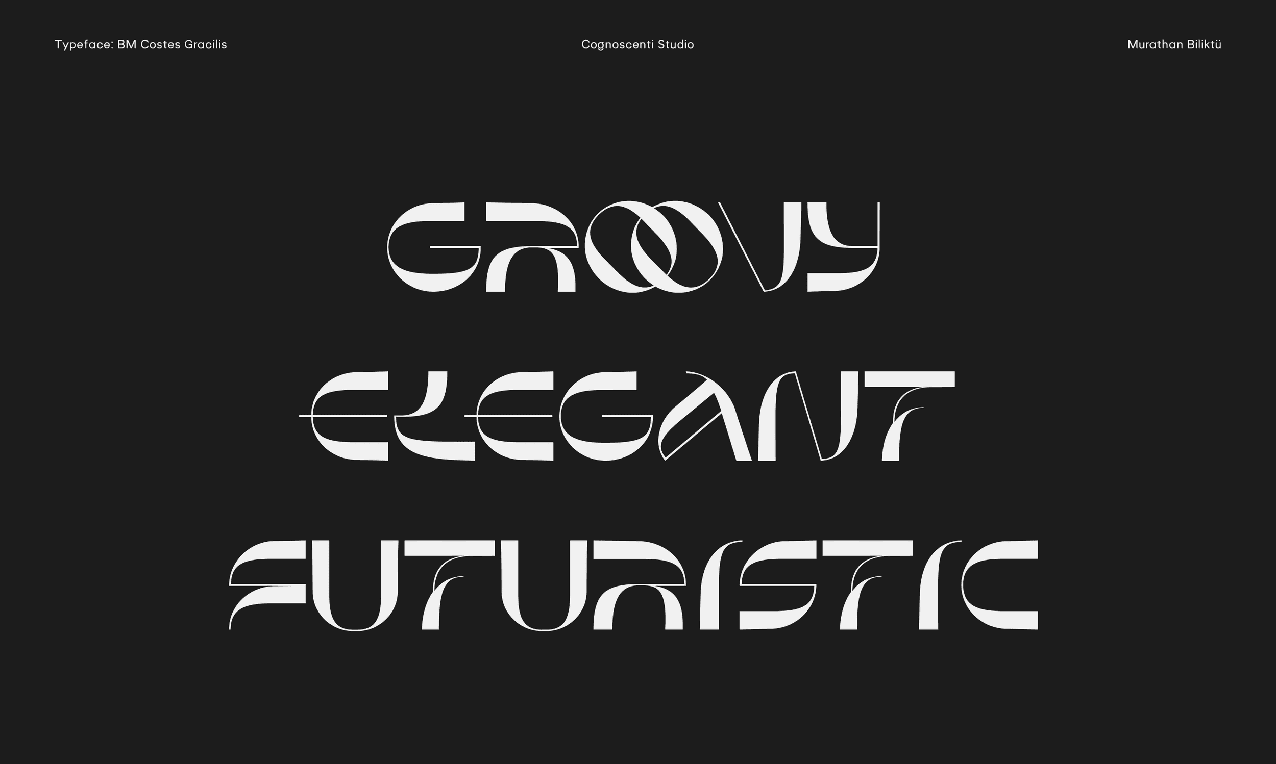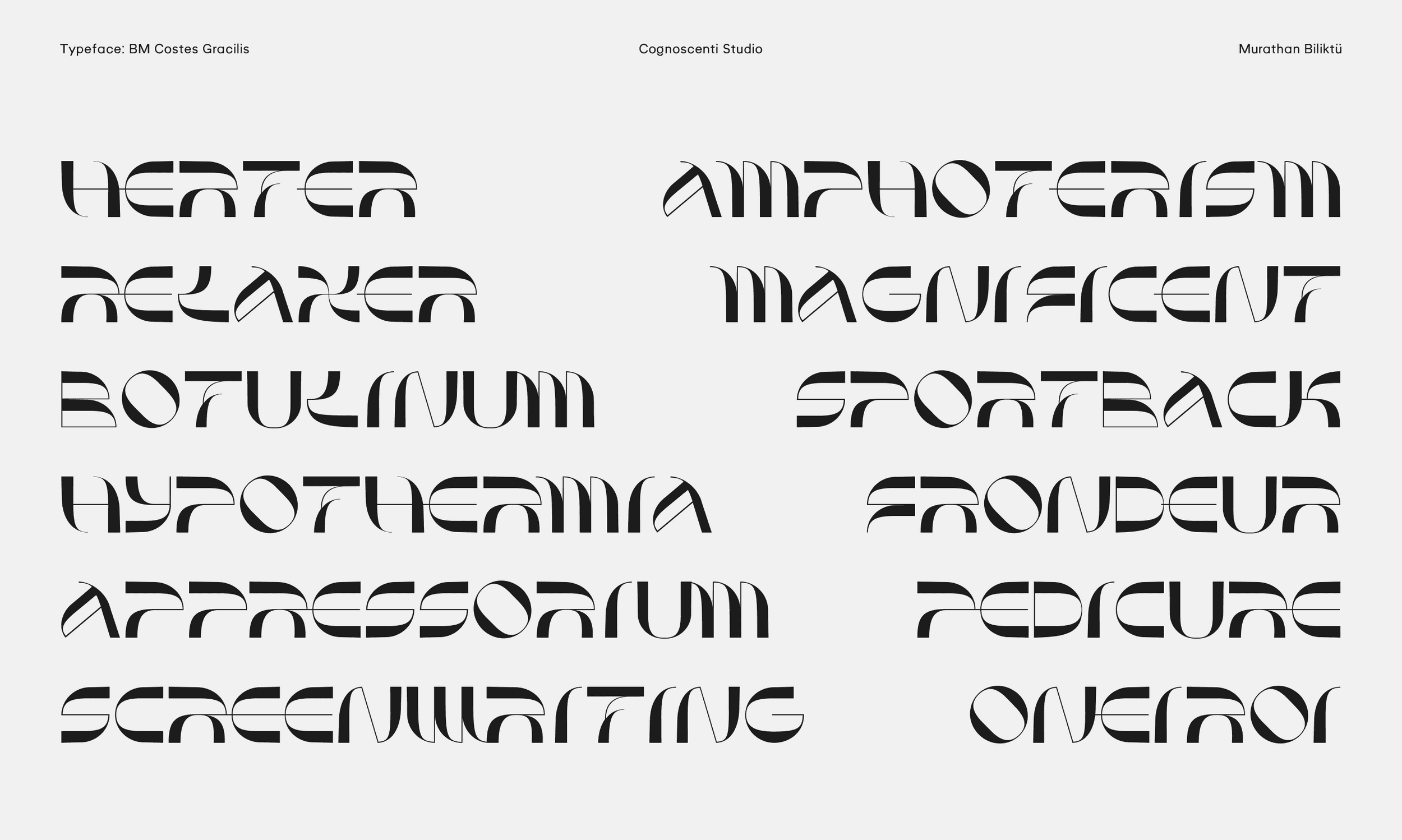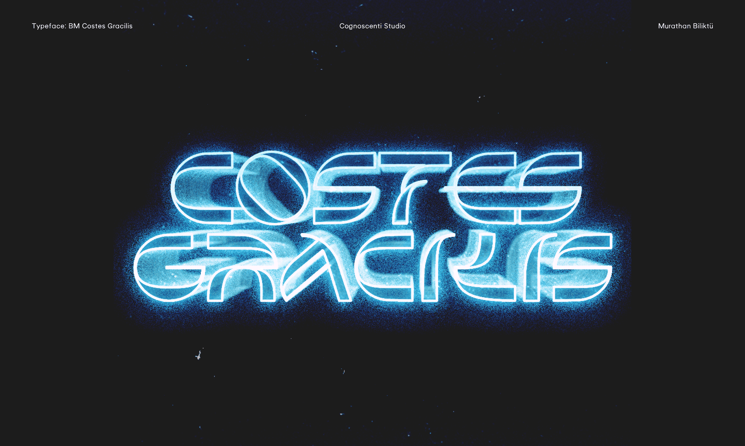 The last summer wind and the last sunset on the Mediterranean shore inspired this piece. Costes Gracilis is a follow-up to Costes, my first typeface. I wanted to develop a version that was more slim and contrast-heavy. To me, type design is a therapeutic endeavour, and I enjoy producing errors. In a way, I like how nothing is flawless. Break the rules, then learn how to break them even more effectively.