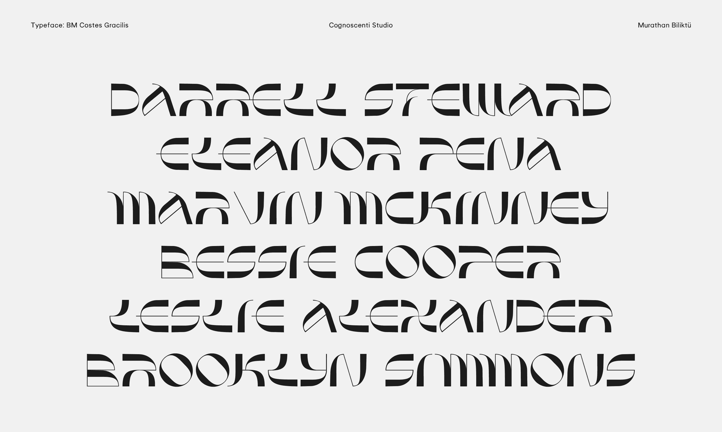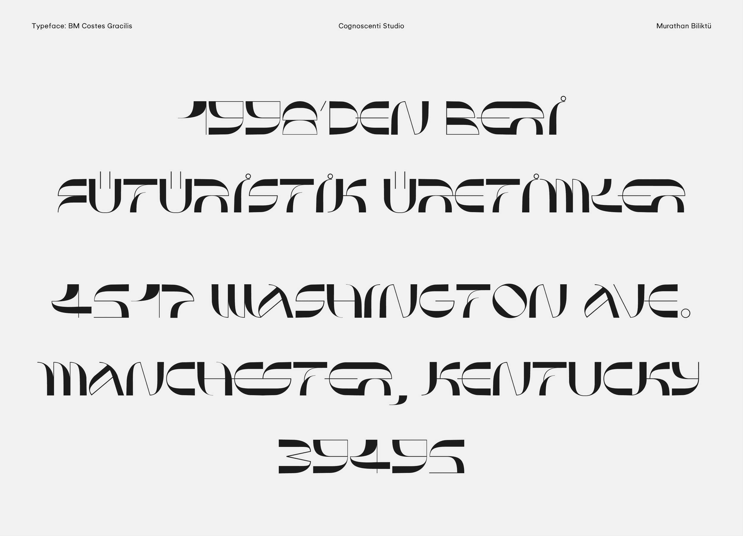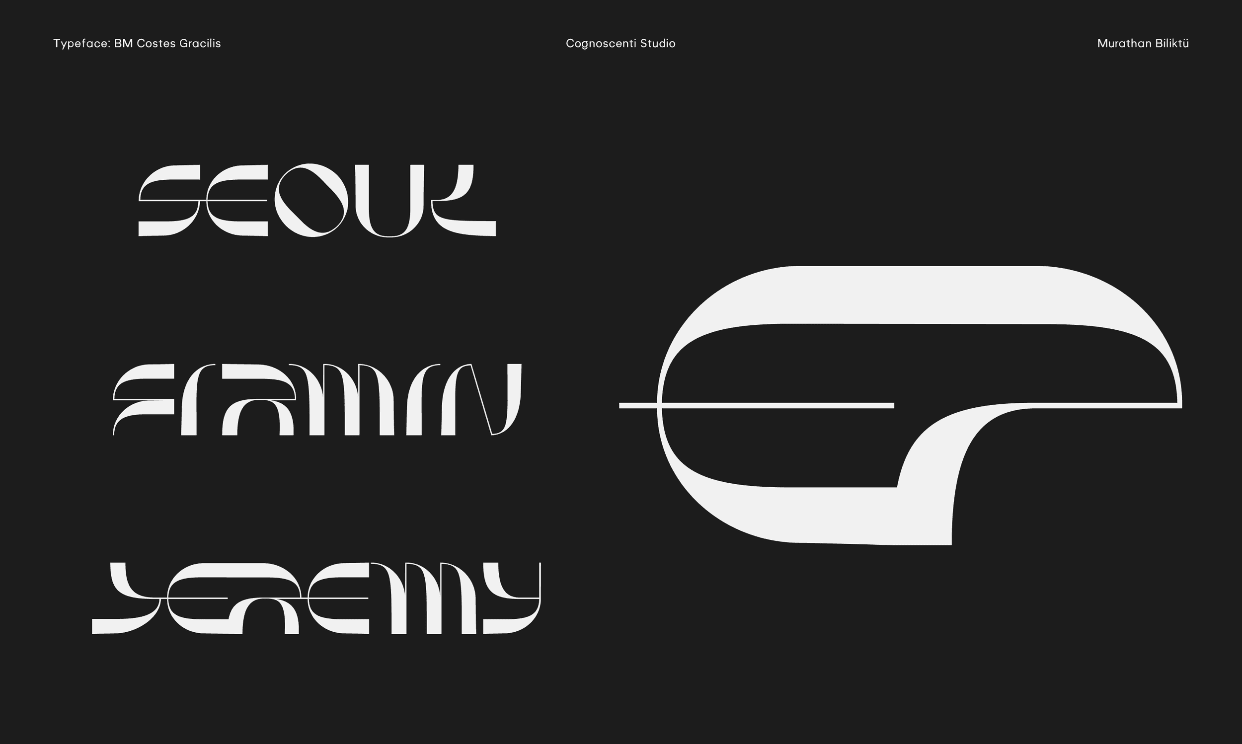 The last summer wind and the last sunset on the Mediterranean shore inspired this piece. Costes Gracilis is a follow-up to Costes, my first typeface. I wanted to develop a version that was more slim and contrast-heavy. To me, type design is a therapeutic endeavour, and I enjoy producing errors. In a way, I like how nothing is flawless. Break the rules, then learn how to break them even more effectively.