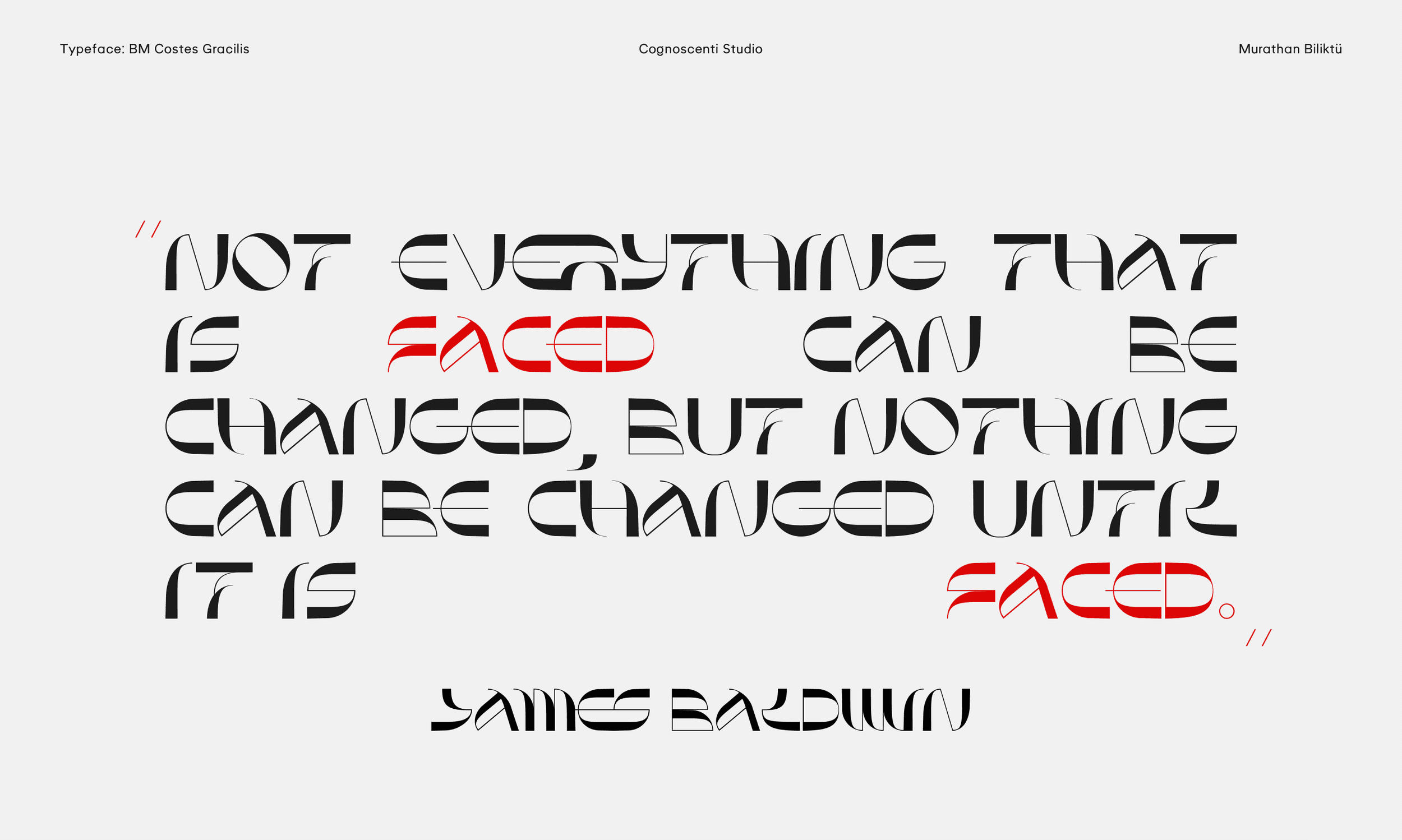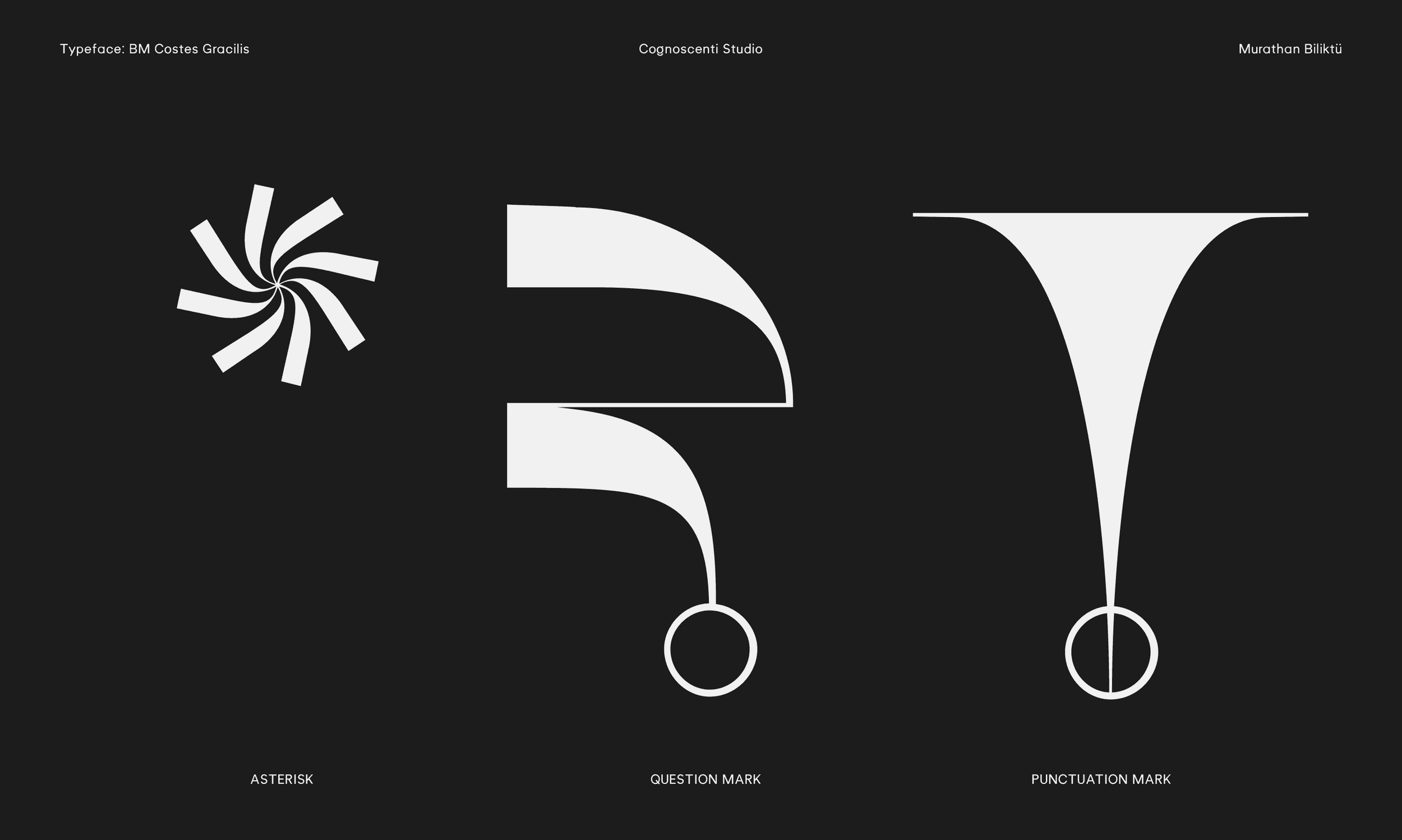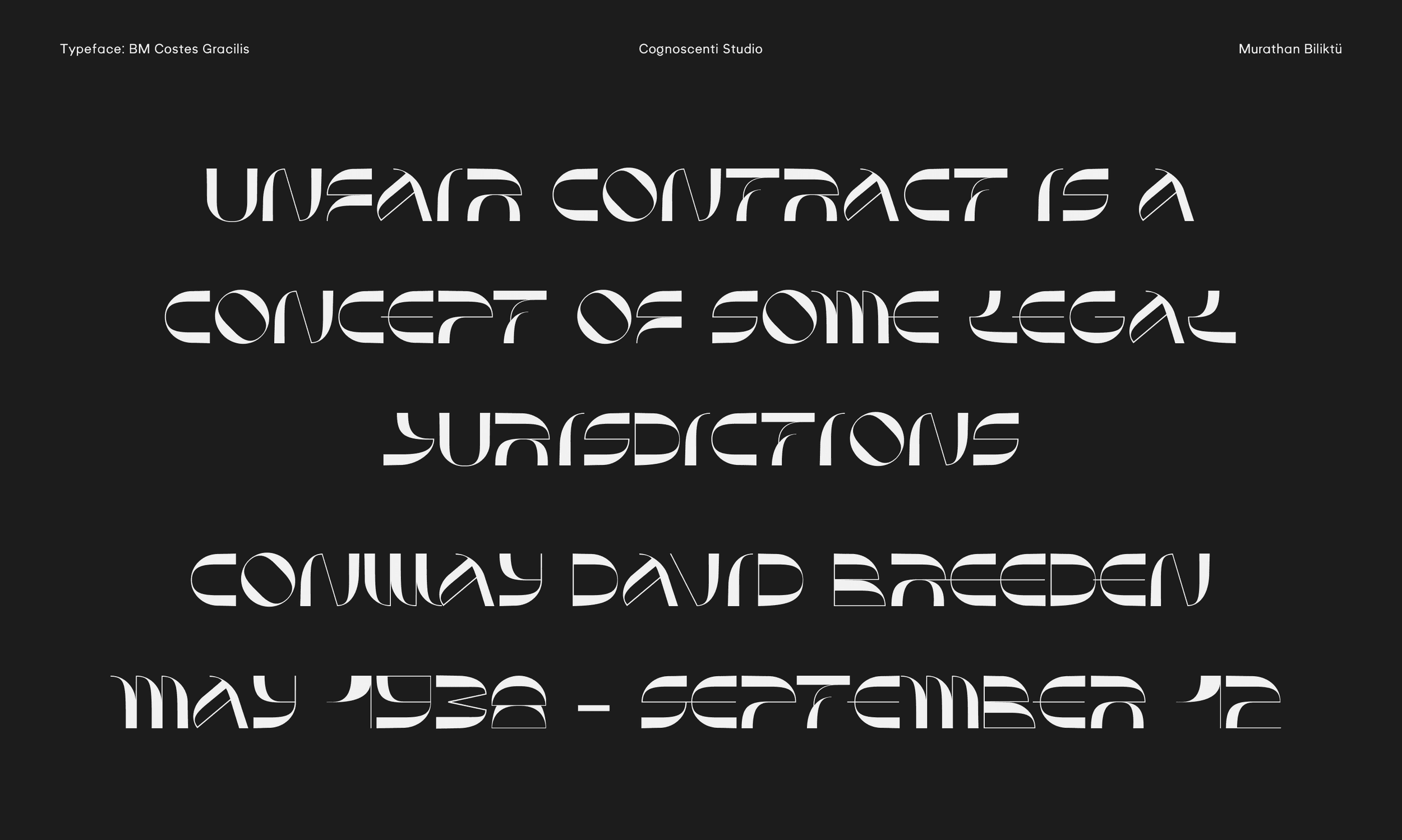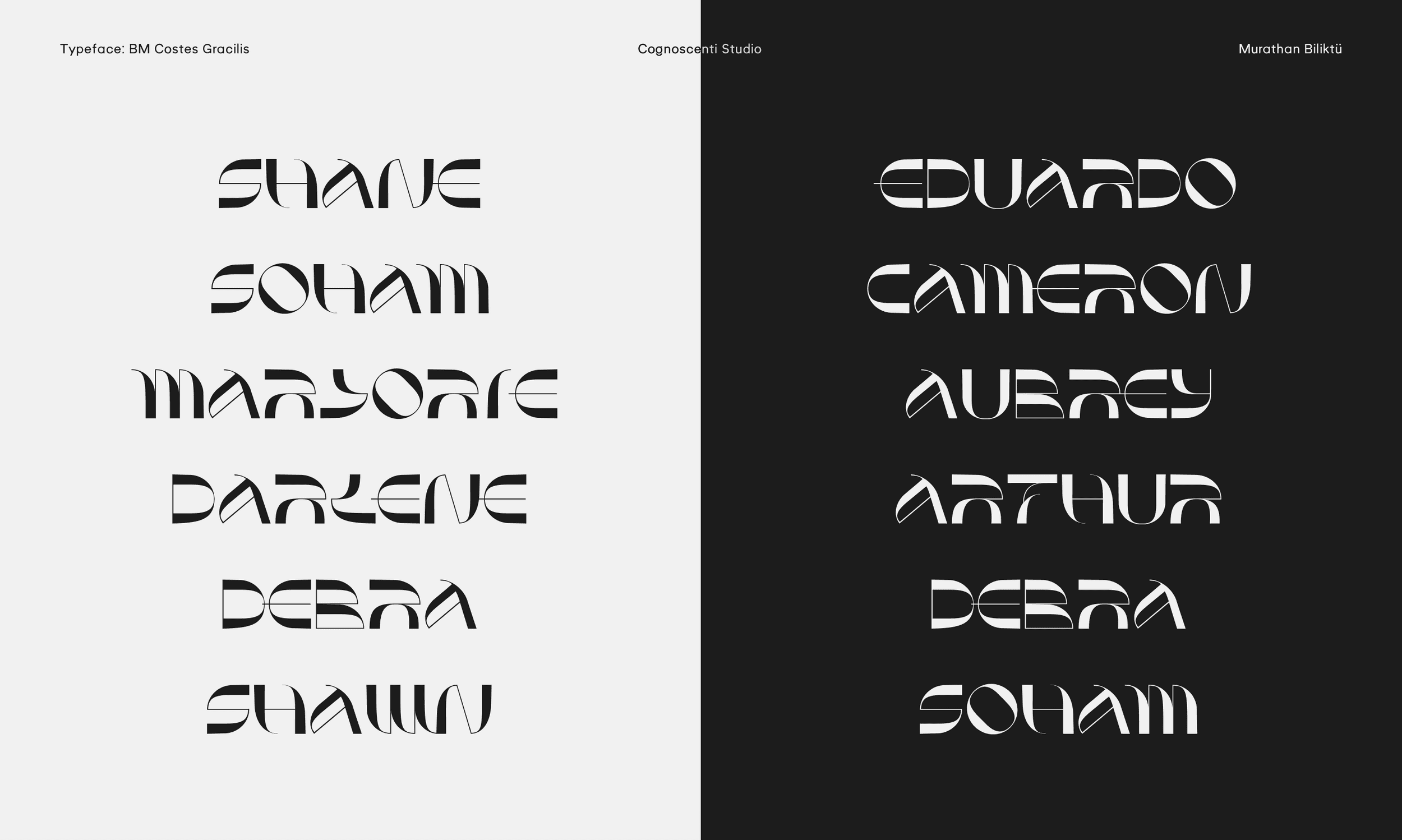 The last summer wind and the last sunset on the Mediterranean shore inspired this piece. Costes Gracilis is a follow-up to Costes, my first typeface. I wanted to develop a version that was more slim and contrast-heavy. To me, type design is a therapeutic endeavour, and I enjoy producing errors. In a way, I like how nothing is flawless. Break the rules, then learn how to break them even more effectively.